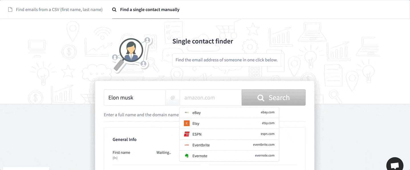 You will be able to upload a CSV with this information: first name, last name, and company name (or domain). Once you upload the data, the tool will try to find the email of each contact from the email format (for example, first.last@company.com). This tool is perfect for discovering emails from a list of business data.